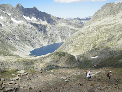 En la bajada de Cabeza Herrera al collado del Sabadón (1.719 m.), nos cruzamos con una pareja que sigue subiendo estoicamente, a pesar de la solanera que les va cayendo encima. Son las primeras personas que vemos en más de 24 horas.