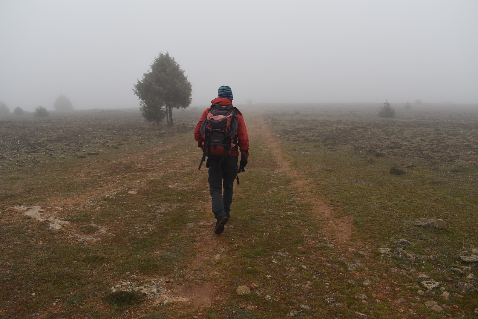 Tras la comida, iremos progresivamente alejándonos del cauce del Duratón. La niebla se espesa. El Maestro nos guía con su GPS, en un sube y baja que nos permite superar varios barrancos subsidiarios del Duratón, hasta un total de ocho. En algunos momentos caminamos al lado de los sembrados e incluso atravesaremos alguno. Nuestro Maestro es increpado por un pastor que conduce un rebaño de ovejas.